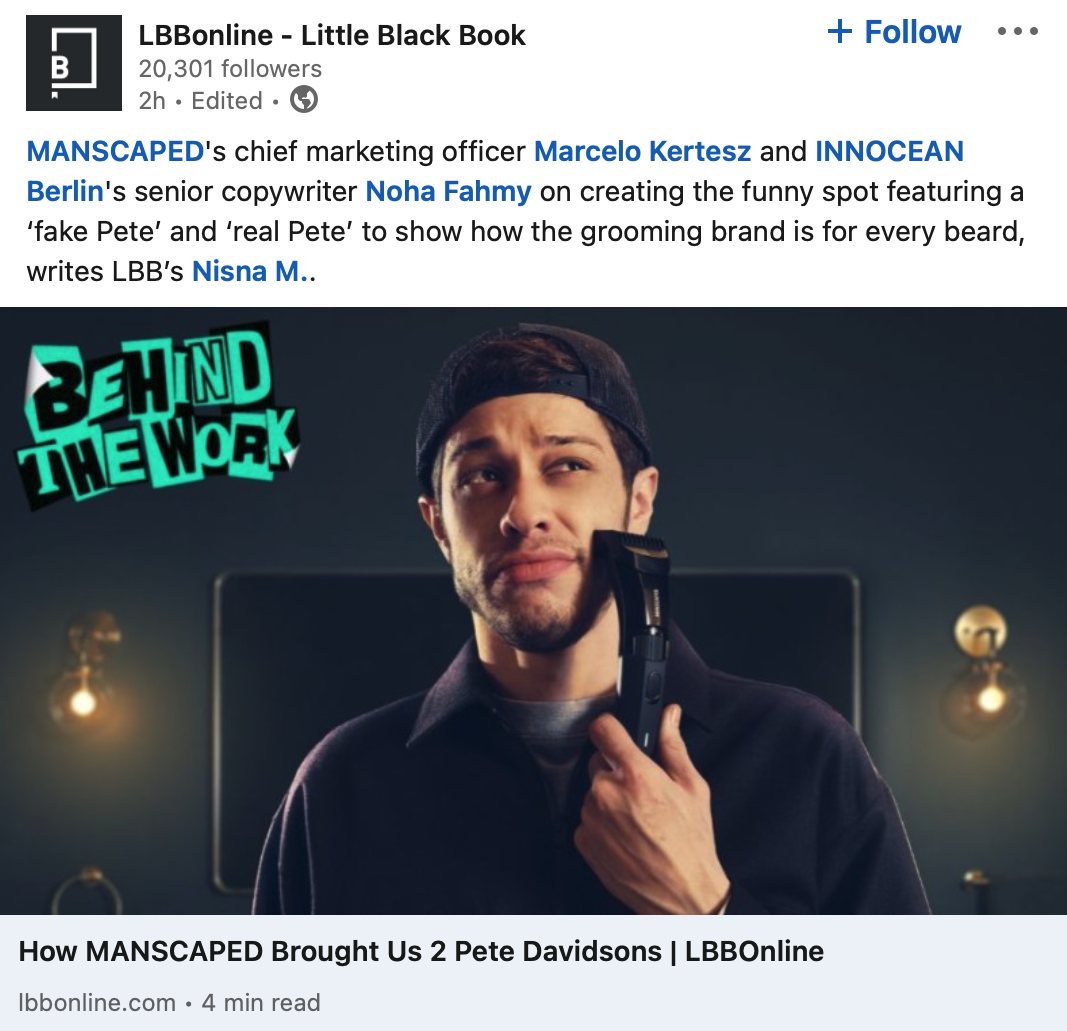 It’s not every day that you get to write comedy for a comedian. So when this brief popped up at the agency, I fought for it to land on my desk. Because who says you’ve got to be a guy to write about guy stuff? And no, I did not meet Pete. He was dating a certain shape-wear mogul at the time, which made him exceedingly unattainable.